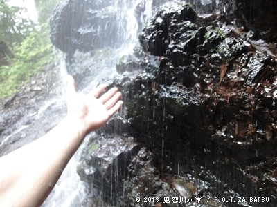 ギャー、滝にタッチ。